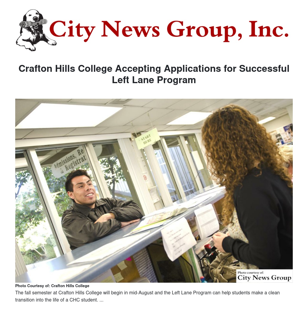 For more information about the Left Lane Program, contact: Karen Peterson: 909-389-3395 or email kpeterso@craftonhills.edu.