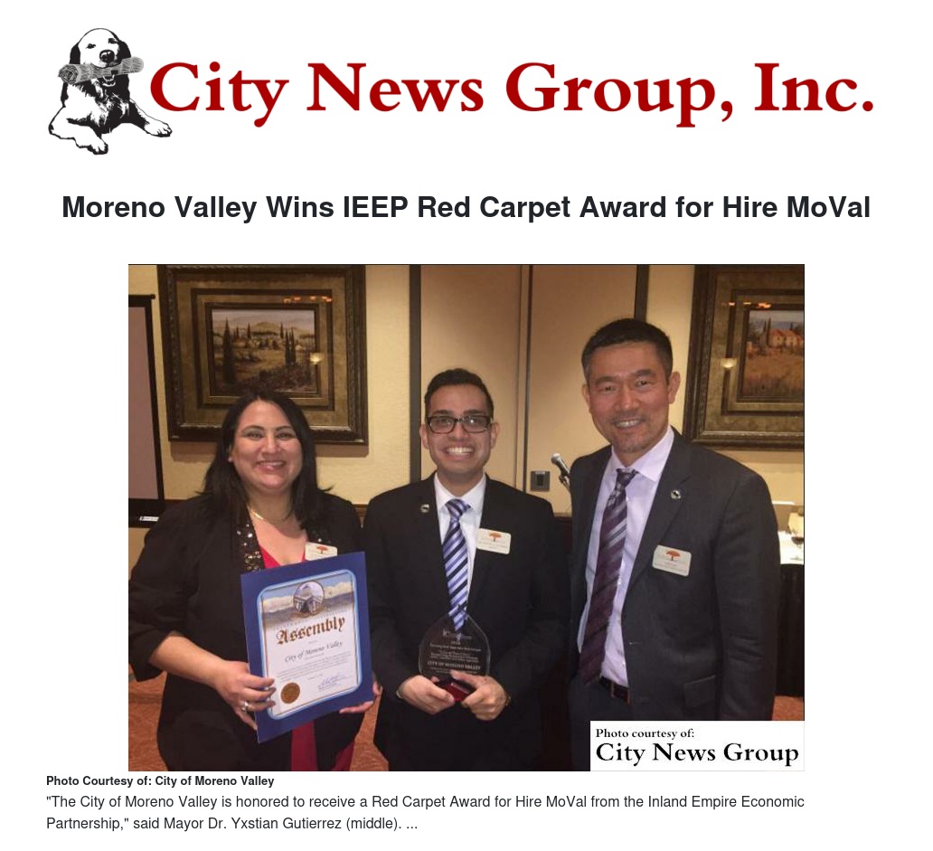 Moreno Valley Wins IEEP Red Carpet Award for Hire MoVal