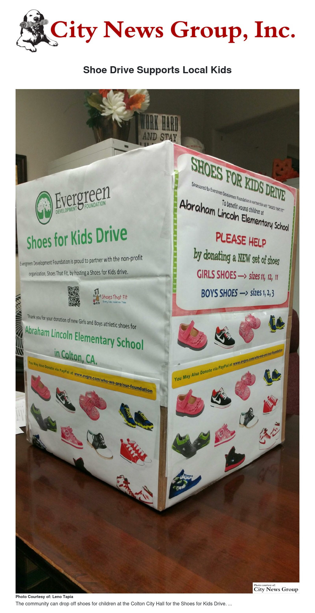 Donatations needed are girl shoes sizes, 11, 12 and 1, and boy sizes 1,2, and 3. A box is placed in the City Hall lobby where shoes can be dropped off at or money donations can be made through PayPal at www.evgre.com/who-we-are/our-foundation/. Colton City Hall is located at 650 N. La Cadena Drive, Colton, CA 92324.
