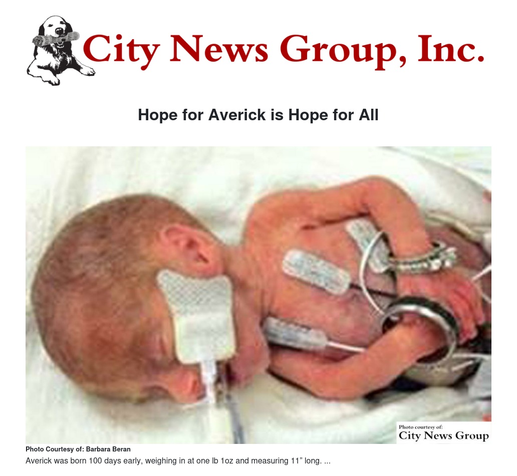 Averick Olson was born 100 days early. When Averick was born he weighed 1lb 1oz and was a mere 11” long. During his 9-month hospital stay, he fought a difficult battle that included multiple procedures, blood transfusions, and over a dozen surgeries. Since coming home, he has continued to combat many complications due to his premature birth.