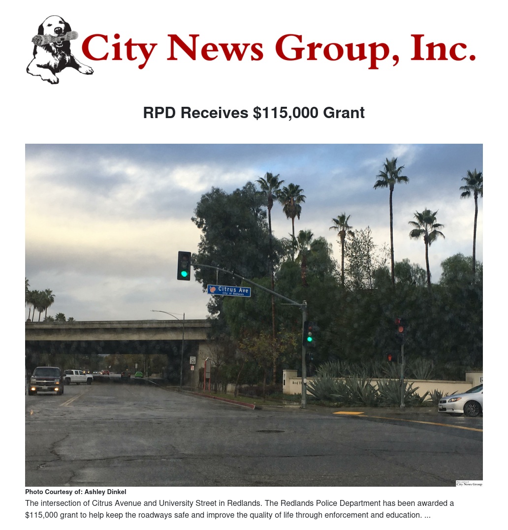 REDLANDS>> The Redlands Police Department has been awarded a $115,000 grant from the California Office of Traffic Safety for a year-long program of special enforcement and public awareness efforts to prevent traffic related deaths and injuries. Redlands Police will use the funding as part of the city’s ongoing commitment to keep the roadways safe and improve the quality of life through enforcement and education.