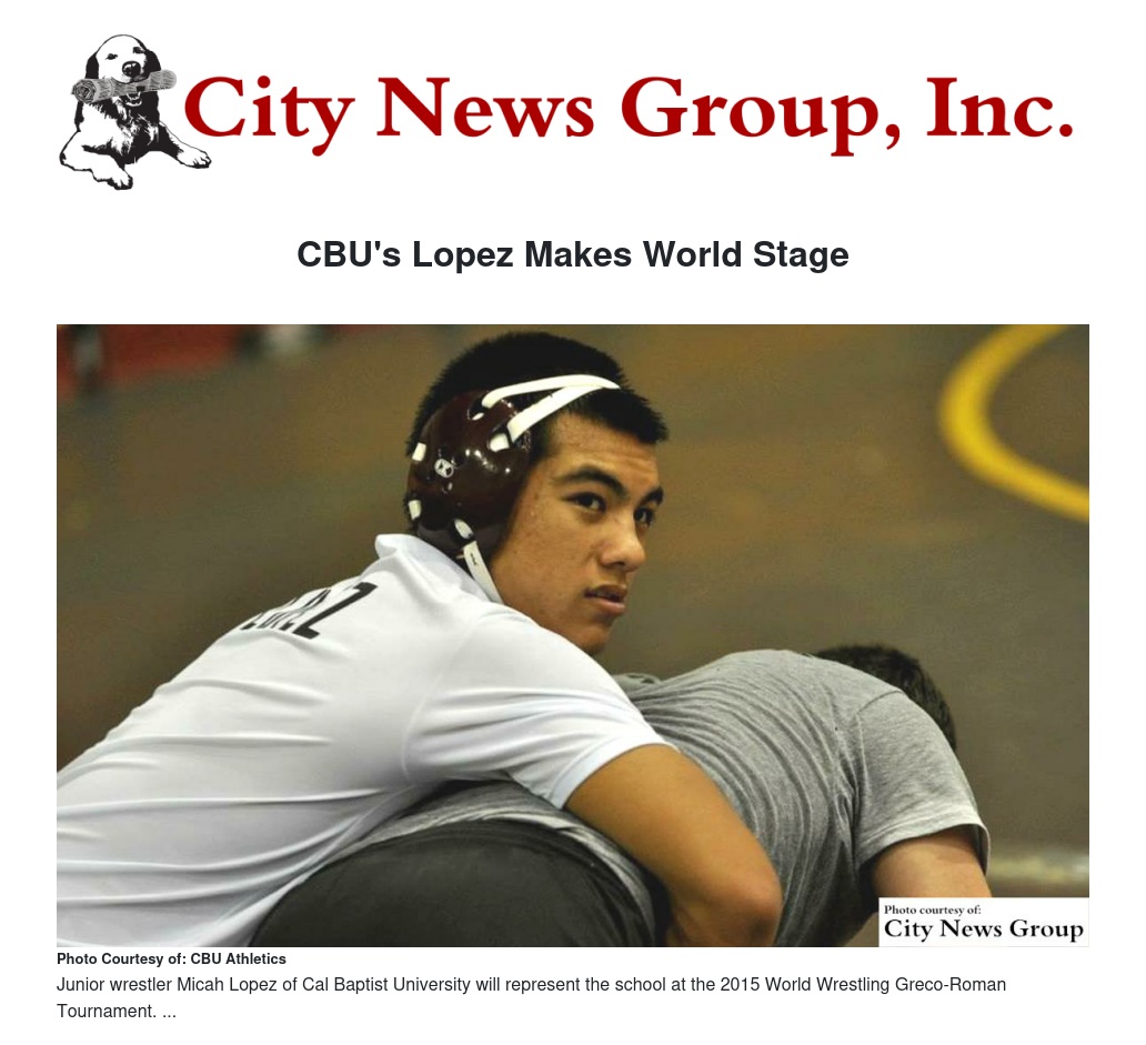 California Baptist University will be represented at the 2015 World Wrestling Greco-Roman Tournament after junior wrestler Micah Lopez advanced to the prestigious event by winning a continental title for his native country of Guam.