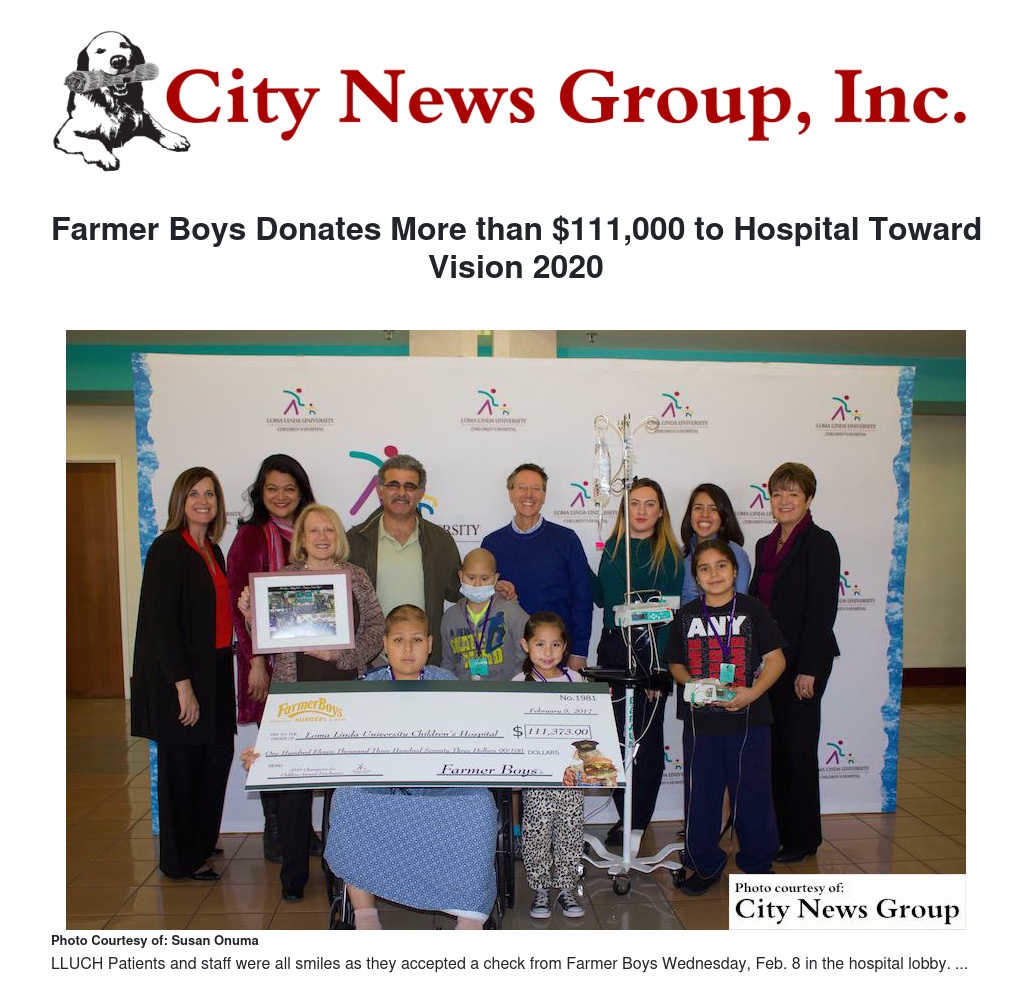 LOMA LINDA>> Representatives from Farmer Boys stopped by Loma Linda University Children’s Hospital with a large check in hand.