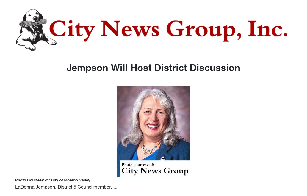 LaDonna Jempson, Moreno Valley Council Member for District 5, is hosting a discussion event Thursday, May 21, from 6 to 8 p.m., at the Edgemont Women's Club located at 21640 Cottonwood Ave.