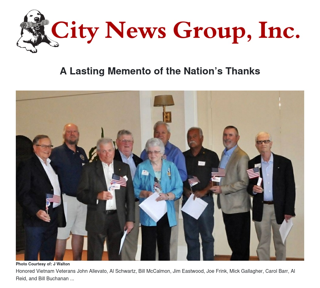 Following the program, Arrowhead Valley Chapter proudly partnered with the “The United States of America Vietnam War Commemoration” in recognition of the 50th Anniversary of the Vietnam War. In a public and dignified ceremony, on behalf of a grateful nation, Chapter Regent Patricia Westerfield had the honor of presenting the Vietnam Veteran Lapel Pin to Inland Empire residents John Allevato, Al Schwartz, Bill McCalmon, Jim Eastwood, Joe Frink, Mick Gallagher, Carol Barr, Al Reid, and Bill Buchanan. All veterans were thanked and provided with a copy of the Presidential Proclamation and the supporting material that explains the symbolism and significance of the lapel pin.