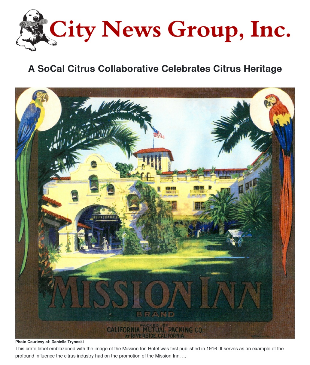- Citrus Legacy: The Mission Inn and Riverside’s Citrus Industry opening Sunday, April 14, 2019 at the Mission Inn Museum explored how Riverside’s citrus industry influenced the Mission Inn and, in many ways, made the Mission Inn possible.