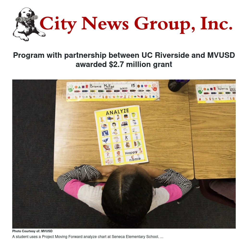 Project Moving Forward, a vocabulary program used at MVUSD schools in partnership with the University of California Riverside, has been awarded a $2.7 million grant from the U.S. Department of Education.