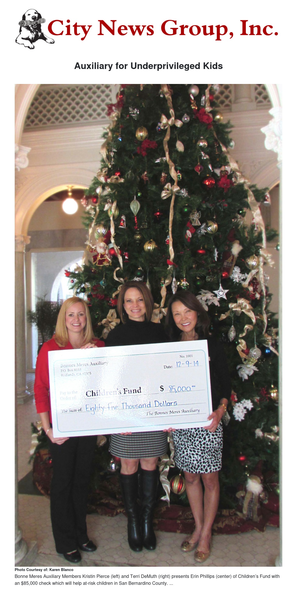Bonnes Meres Auxiliary’s Kristin Pierce and Terri DeMuth presented Erin Phillips, president and CEO of Children’s Fund, with a check for $85,000 on Thursday, Dec. 11. The money will help fund many of the programs for the underprivileged kids in local communities. The check presentation was made at the Bonnes Meres holiday breakfast held at the Burrage Mansion in Redlands.