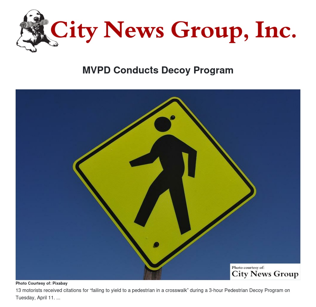 The Moreno Valley Traffic Team conducted a 3-hour Pedestrian Decoy Program on Tuesday, April 11 in which 13 motorists received citations for “failing to yield to a pedestrian in a crosswalk.” In addition to the crosswalk citations, one motorist was cited for cellphone use, one for expired registration and two for being unlicensed.