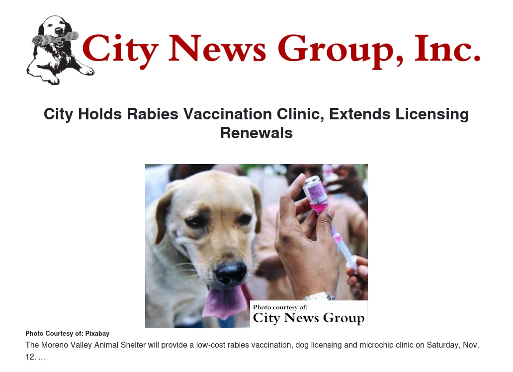 “We feel that it’s important to give pet owners the opportunity to participate in the vaccination clinic and to extend the renewal date so that pets can be vaccinated during the clinic,” said City Manager G. Harold Duffey. “We appreciate the cooperation our residents have shown as we bring licensing back to Grand Terrace.”