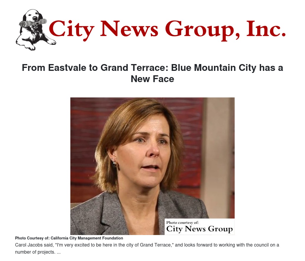 Her municipal career has spanned over 25 years. Prior to coming to Grand Terrace, Jacobs worked as the city manager of Eastvale from September 2012 until August 2014.