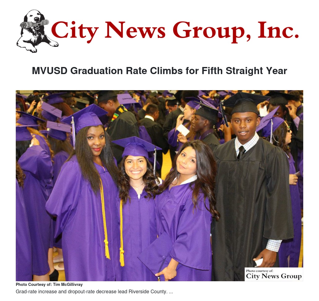 The new MVUSD graduation rate of 86 percent is cause for celebration, said School Board President Jesús M. Holguín. “We’ve worked very deliberately to achieve these results,” he said. “Our principals, teachers and counselors work together to identify and meet the needs of individual students at risk of not graduating and it’s making all the difference. We’re so proud of the work they do, the care and concern with which they do it, and the exceptionally positive results we’re seeing.”