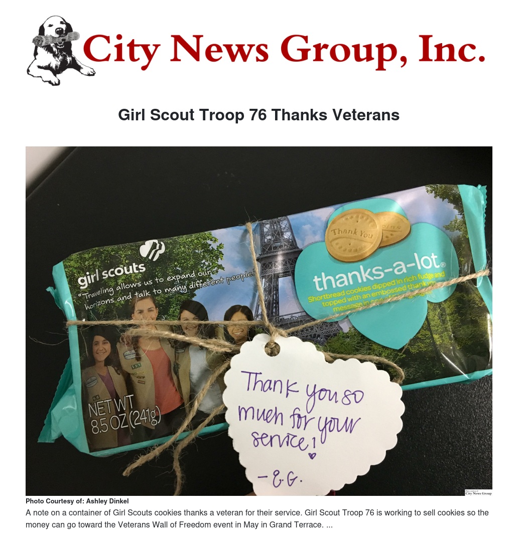 GRAND TERRACE>> Girl Scout Troop 76 is working hard to help show appreciation for the veterans in the local community with the help of delicious cookies that the community can enjoy.