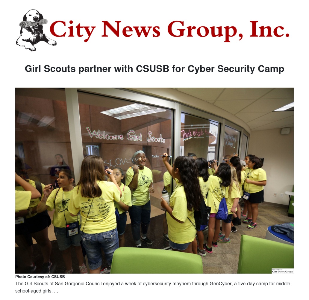 The Girl Scouts of San Gorgonio Council again partnered with CSUSB to present the 2016 edition of GenCyber, a five-day camp in which middle school girls, ages 10 to 15, step on campus to learn cyber security theories from prominent industry leaders. Recruitment efforts include outreach to Title 1 schools and underserved communities.