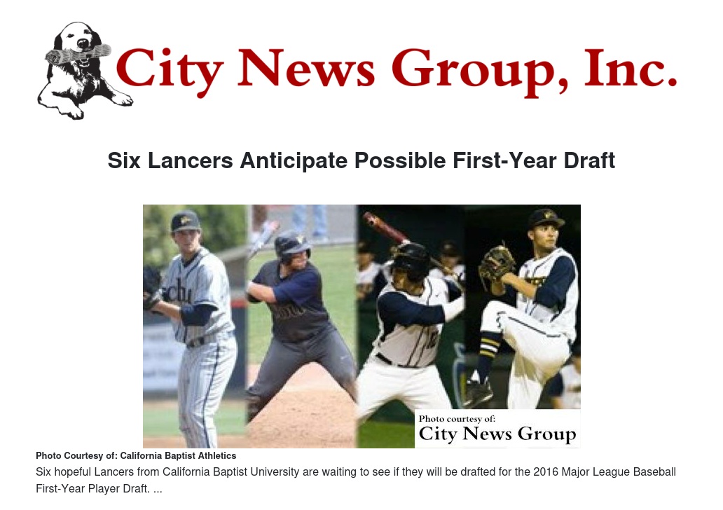 RIVERSIDE >> Dreams will come true for 1,200 baseball players during the 2016 Major League Baseball First-Year Player Draft, taking place Thursday to Saturday, June 9 through 11. Within that mix, six California Baptist University players will be waiting and hoping to see their names called.