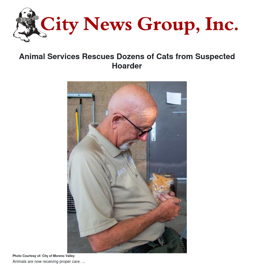 Dozens of cats and three dogs in various stages of neglect were rescued today from a Moreno Valley home in the 22000 block of La Jolla Drive and are now receiving medical evaluation and treatment as needed at the City’s Animal Shelter.
