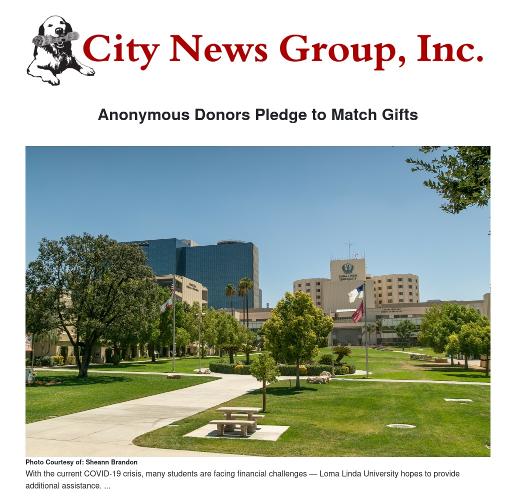 An anonymous couple has committed to matching donations to Loma Linda University’s Student Relief Fund dollar-for-dollar up to $100,000. The donors, both School of Medicine graduates, are challenging those able to make gifts to the fund.