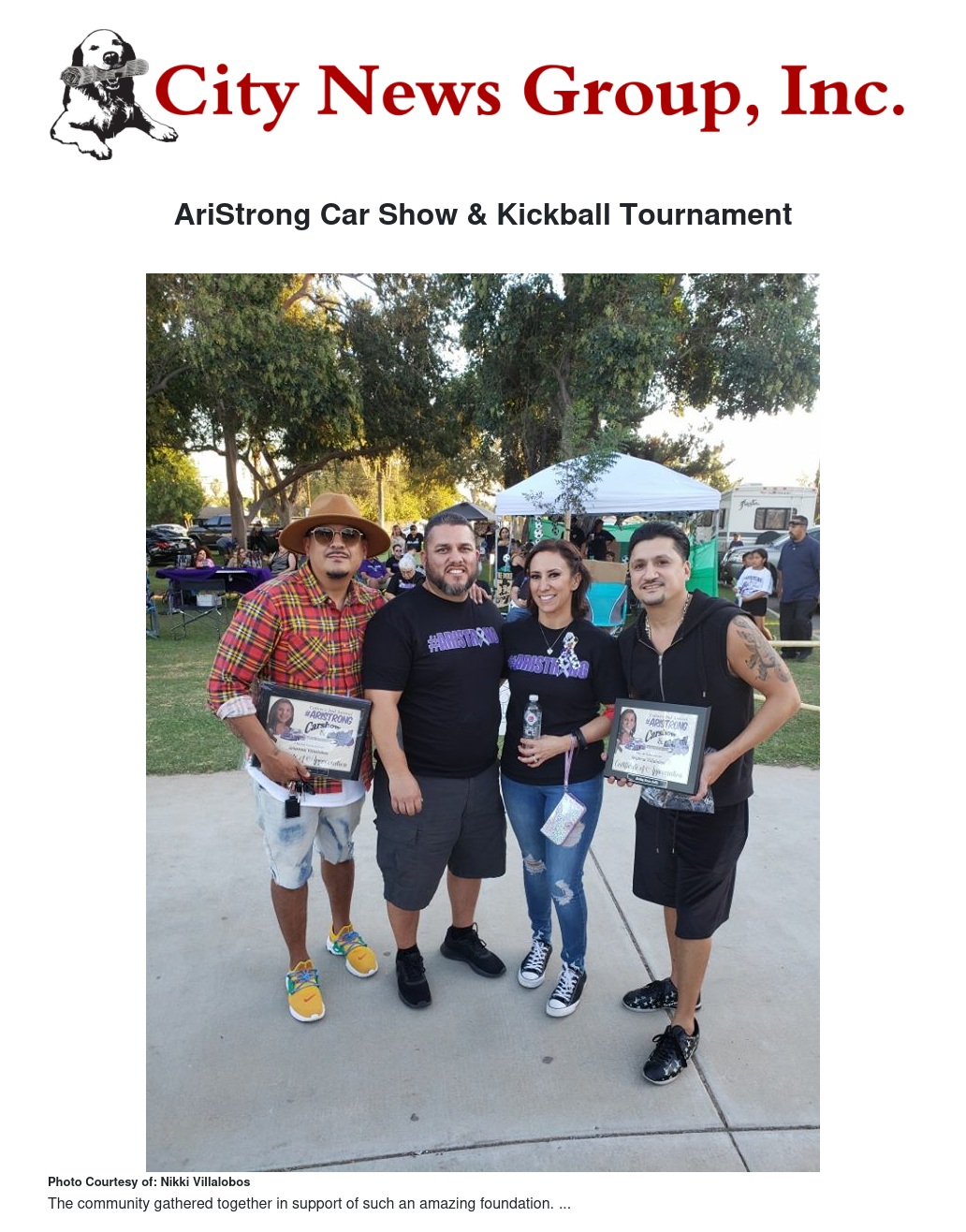 Arianna Villalobos - both a shining student-athlete, and epitome of what it meant to be a loving and genuine person, was diagnosed with stage IV brain cancer at the tender age of 14 last October and spent the next 51 weeks battling the disease before taking her last breath October 1st this year. Following the months after her passing, the Villalobos family and a team made up of friends and volunteers organized a Kickball tournament and Car Show in celebration of her life and also as a kickstart to their own organization that, upon the request of Ari, would assist and provide support to families from all over who were going through the same trials the Villalobos family had recently endured.