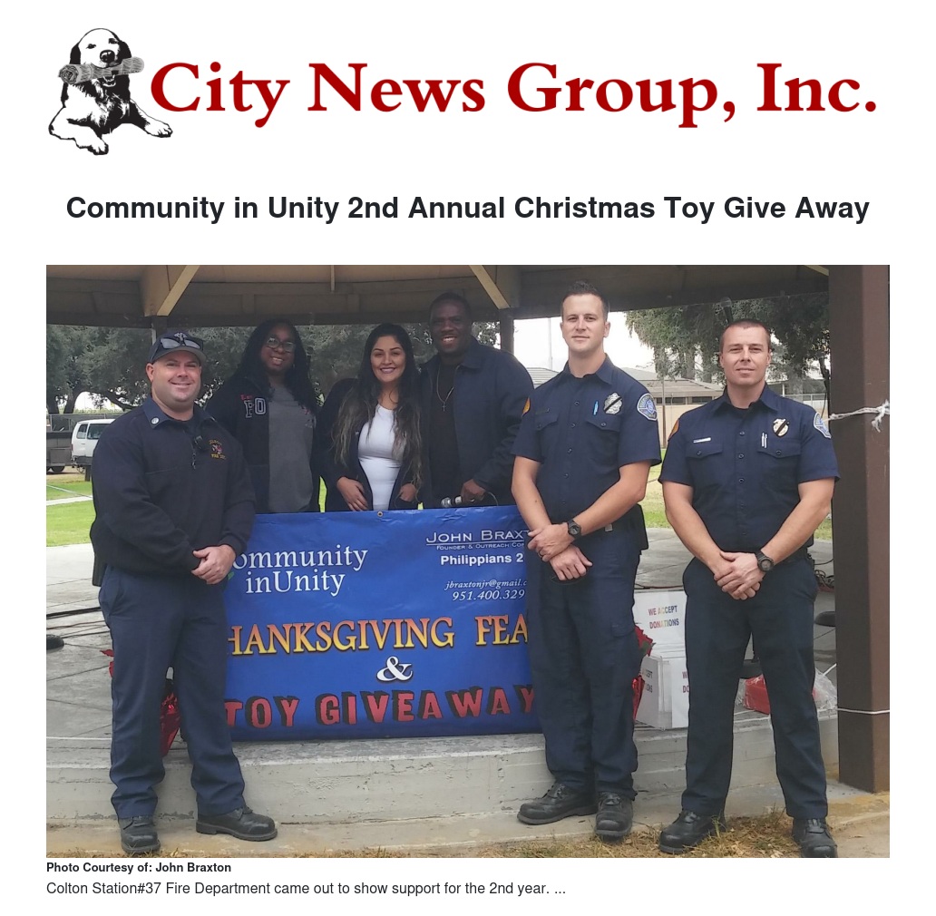 They had a awesome time this past Saturday, Community in Unity Outreach at Veterans Park, 290 E. O Street, Colton Ca 92324, where AssemblyMember Eloise Gomez Reyes and her Husband presented a Certificate of Recognition to Community in Unity. They appreciate Colton Station#37 Fire Department, for coming out again for this year Christmas Second Annual Toy giveaway, where the Fire Department passed out fire hats to the Children also, Salon Success Beauty Schools and Hair Phanatics Salon of Highland gave over 60 free hair cuts. Over 150 families were blessed with hot bowls of Chili and corn bread, bags of groceries, free clothing, and Fit Fearless Training 4Life exercises by Robert Briones. After that the kids were treated to granola bar's and juice. They also would like to acknowledge Mental Health System, His Hiding Place for Domestic Violence for Women, S.B. County head start, Center for Employment training, Dignity Memorial, Inland Behavioral Health Services, Church of fire in Christ Street team ministry, 5Lixs, Women Bonded by Courage.
