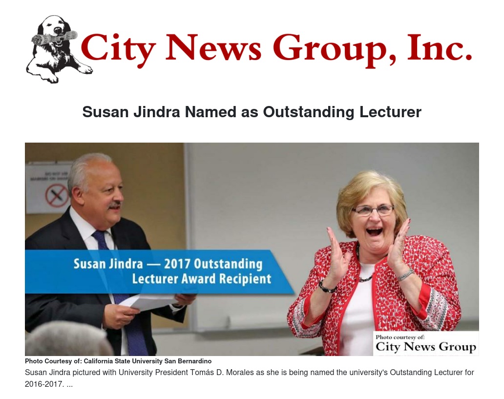 In a letter to the president, the outstanding faculty nominating committee said Jindra’s “colleagues and students greatly benefit from her 13 years of experience as a teacher in the Riverside Unified School District and her 21 years of experience as an administrator in the Jurupa, Yucaipa-Calimesa, Moreno Valley, and Perris Union School Districts.