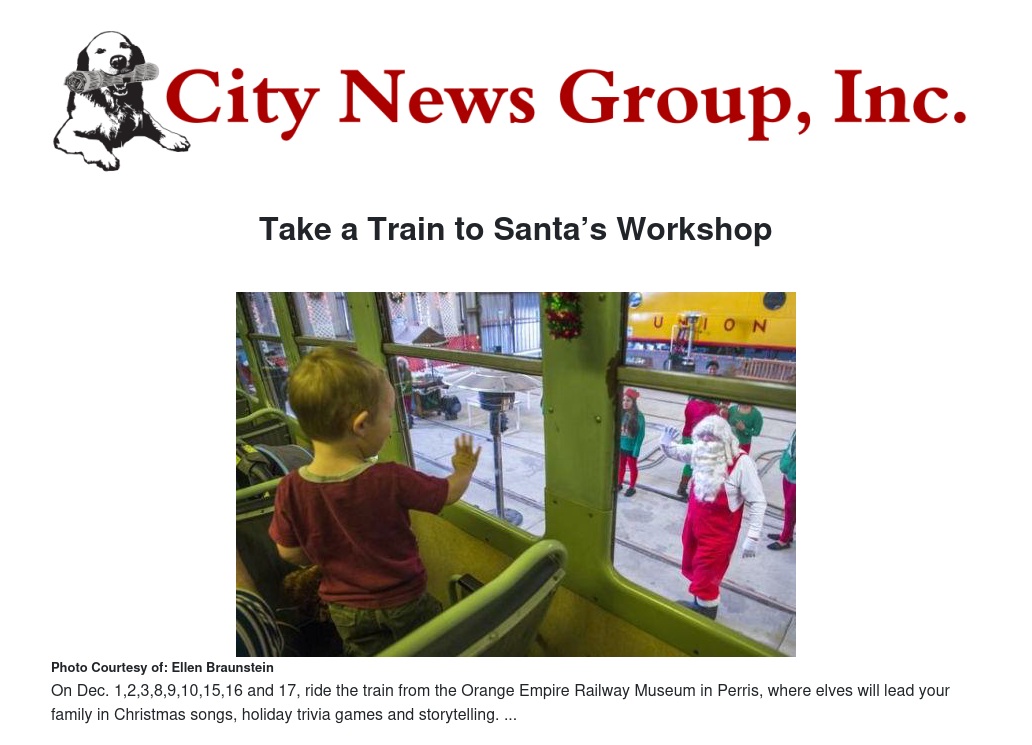 On Dec. 1,2,3,8,9,10,15,16 and 17, ride the train from the Orange Empire Railway Museum in Perris, where elves will lead your family in Christmas songs, holiday trivia games and storytelling.