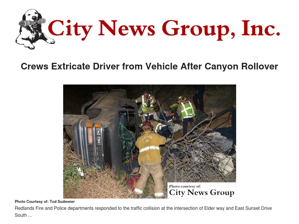 Redlands Fire and Police departments responded to the traffic collision at the intersection of Elder way and East Sunset Drive South at 7:17 p.m. on Tuesday, March 15. The vehicle, a Chevrolet pickup, went over an embankment and came to rest in a canyon about 200 feet below the roadway.
