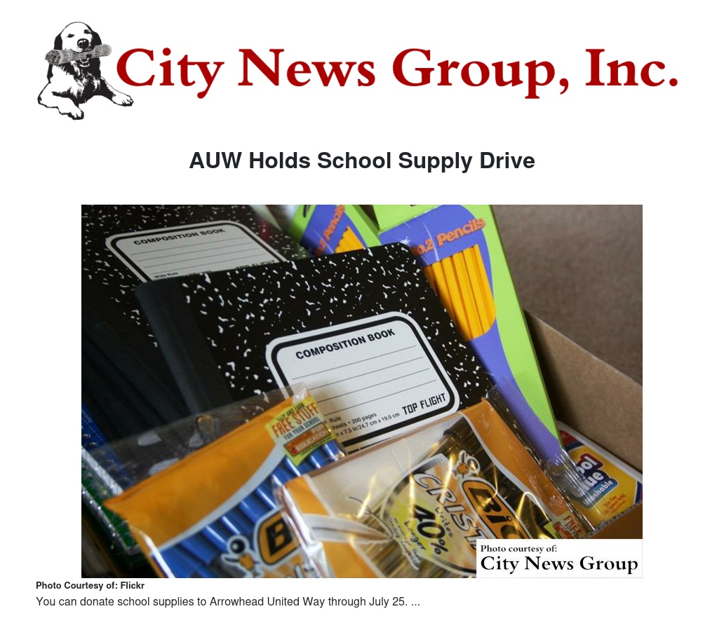 You can Text “UWSchoolDrive” to 71777 to give though your mobile device. Or, mail checks made payable to Arrowhead United Way to 646 North D Street, San Bernardino, CA 92401. If you are interested in donating supplies, they can be dropped off at AUW’s office between the hours of 8 a.m. and 3:30 p.m.