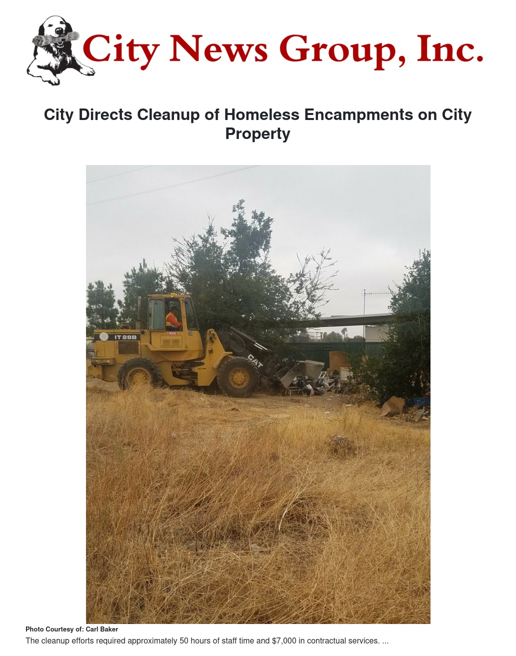 In September City streets crews used heavy equipment to clean debris from abandoned camps on City property near the intersection of Wabash Street and Lugonia Avenue and in the Santa Ana River wash at Riverview Drive and Church Street. Cleanup at each location took City crews more than two days to complete.