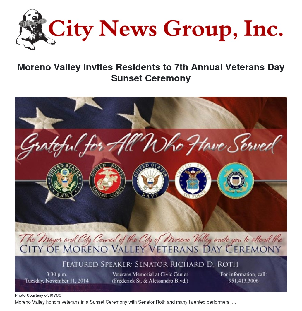 The City of Moreno Valley will host the 7th annual Veterans Day ceremony at the Moreno Valley Veterans Memorial on Tuesday, Nov. 11 at 3:30 p.m. This year's featured speaker will be Senator Richard D. Roth.