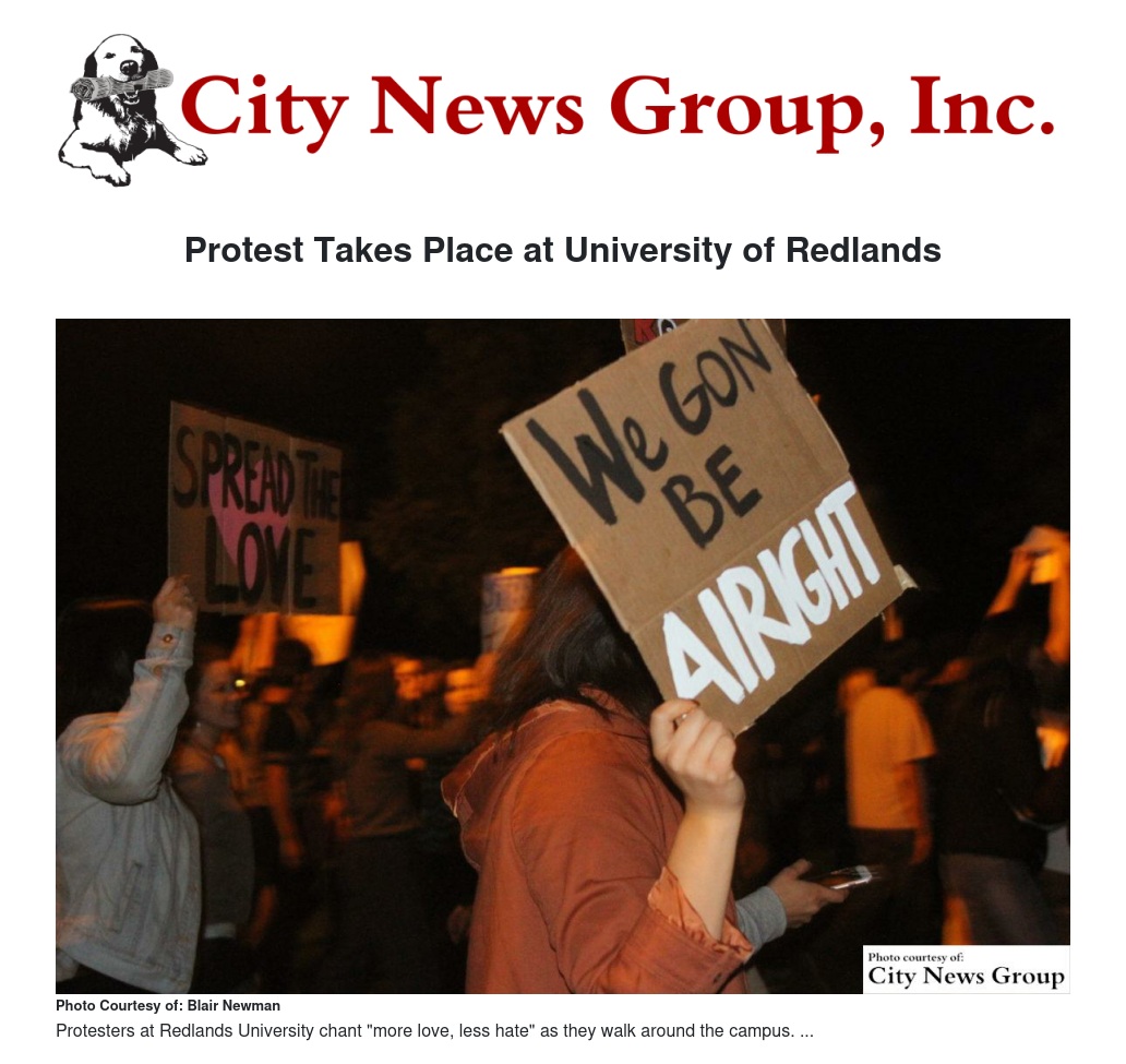 Damara Pratt, a student at Redlands University, attended the meeting and said she was disappointed to find other organizations had not come forth and proposed any course of immediate action. After speaking to a few students, Pratt said she found some had the same political beliefs as she did. Pratt took action the next morning by creating a Facebook page asking students to organize a protest who shared her political beliefs. In 10 hours, many students of Redlands University had organized a “March Against Hate” protest for that evening.