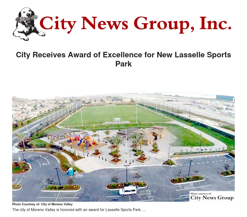 The City of Moreno Valley received an Award of Excellence from the California Park and Recreation Society (CPRS) for Lasselle Sports Park.