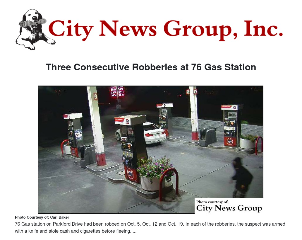 The station had also been robbed on Oct. 5 and again on Oct. 12. In each of the robberies, the suspect was armed with a knife and stole cash and cigarettes before fleeing.