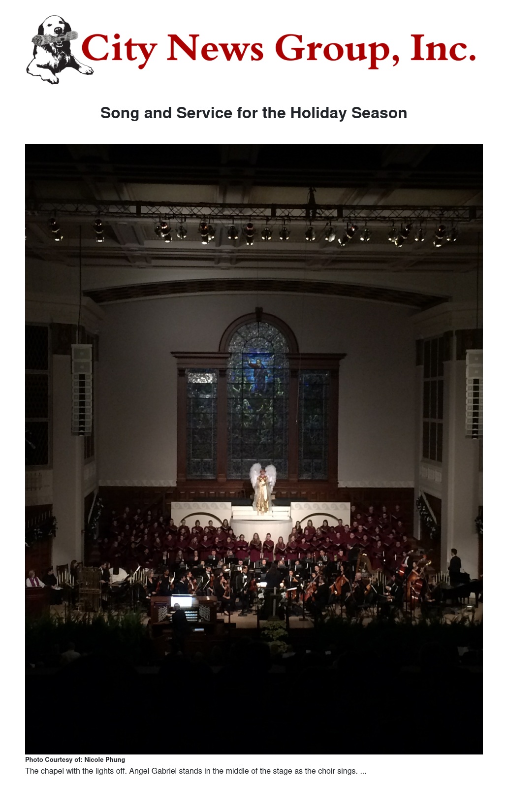 The ceremony started with a prelude that welcomed its guests into the Christmas decoration-themed chapel. There were ornaments hanging from the walls and an angel stood in the middle of the stage. A band with violins, an organ, trumpets, harp, and other instruments played “Fantasy and Chorale.” The choir was later introduced and the lights dimmed.