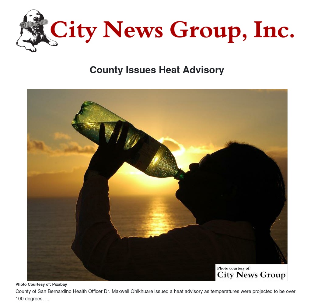 SAN BERNARDINO >> County of San Bernardino Health Officer Dr. Maxwell Ohikhuare issued a heat advisory in preparation for above average temperatures that recently came to the Inland Empire.