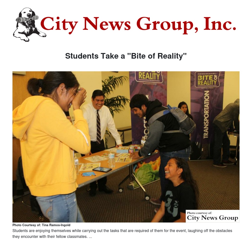 The students are part of GearUp, also known as Gaining Early Awareness and Readiness for Undergraduate Programs, a U.S. Department of Education program which provides federal funding for state and partnership grants to help increase the number of low-income middle and high school students who are prepared to enter and succeed in post-secondary education. The Bite of Reality program is offered by the Richard Myles Johnson Foundation, the state foundation for credit unions in California and Nevada.