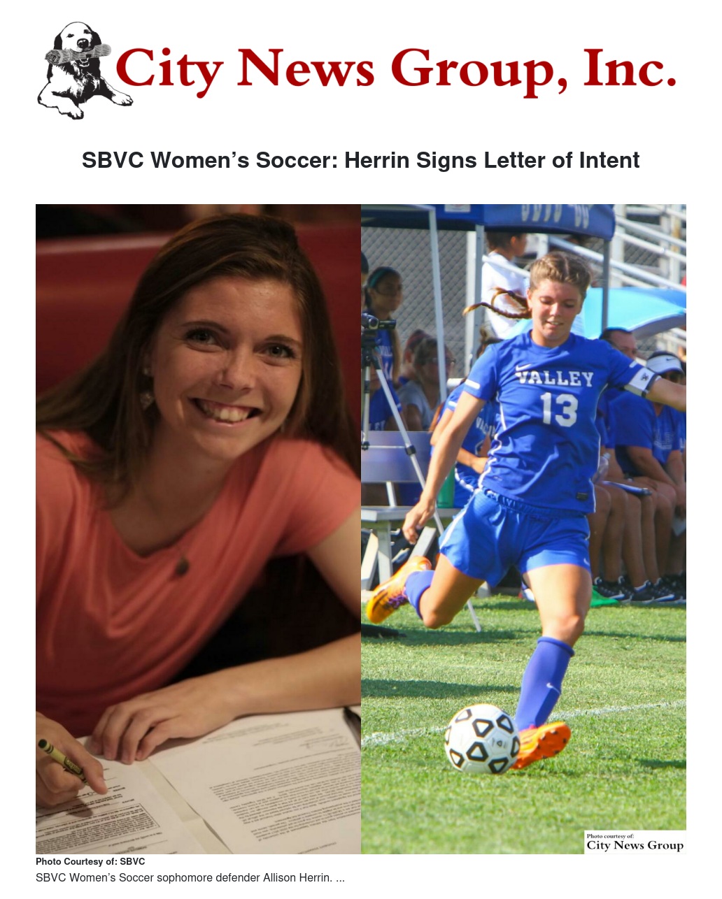 SAN BERNARDINO >> SBVC Women’s Soccer sophomore defender Allison Herrin (Highland Citrus Valley) has signed a letter of intent with University of Arkansas at Pine Bluff.
