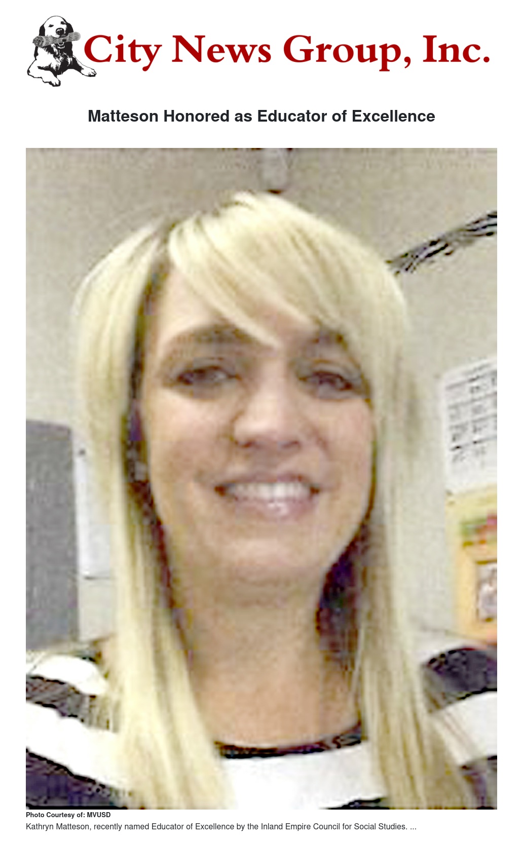 Vista Heights Middle School Social Studies department's Kathryn Matteson was recently honored as an Educator of Excellence by the Inland Empire Council for the Social Studies.