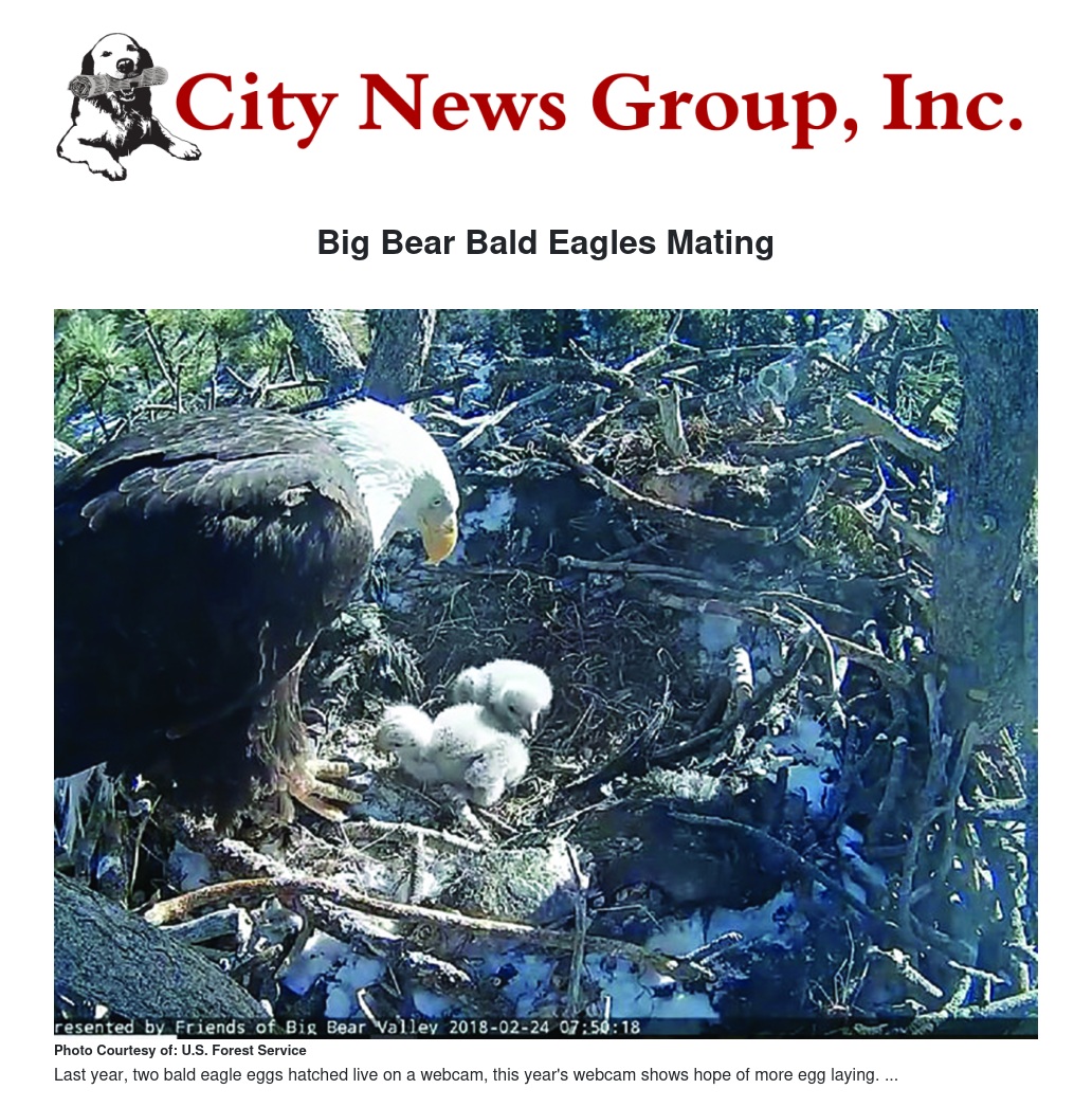 The webcam monitors a nest on national forest lands near Big Bear Lake’s north shore. The area around the nest is closed to all public entry until June 22, 2019. The closure encompasses Grout Bay Picnic Area, Grays Peak Trail and surrounding National Forest areas. No entry, including snow play on the edges of the area, is allowed. Bald eagles during nesting season are sensitive to human interference and may abandon nesting activities if feeling threatened.