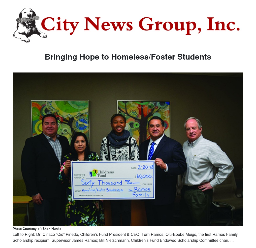 Children’s Fund, a 30-year-old nonprofit focused on the needs of vulnerable children, is pleased to announce the establishment of the Ramos Family Endowed Scholarship Fund. A $50,000 gift was made by San Bernardino County Board of Supervisor James Ramos and his family to establish the fund.