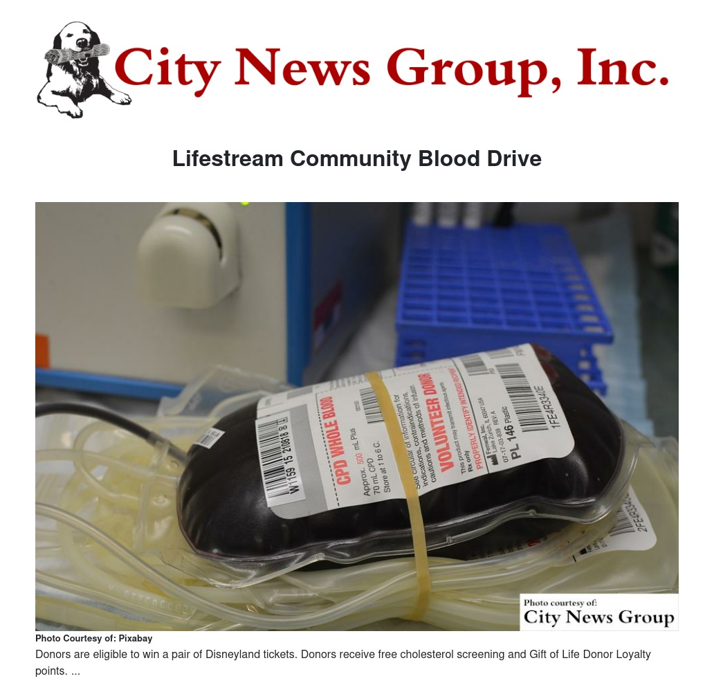 Donors are eligible to win a pair of Disneyland tickets. Donors receive free cholesterol screening and Gift of Life Donor Loyalty points. These points can be redeemed in the online donor store at www.LStream.org. Those ages 18-44 years may also register for Be The Match bone marrow screening at all donor locations free of charge.