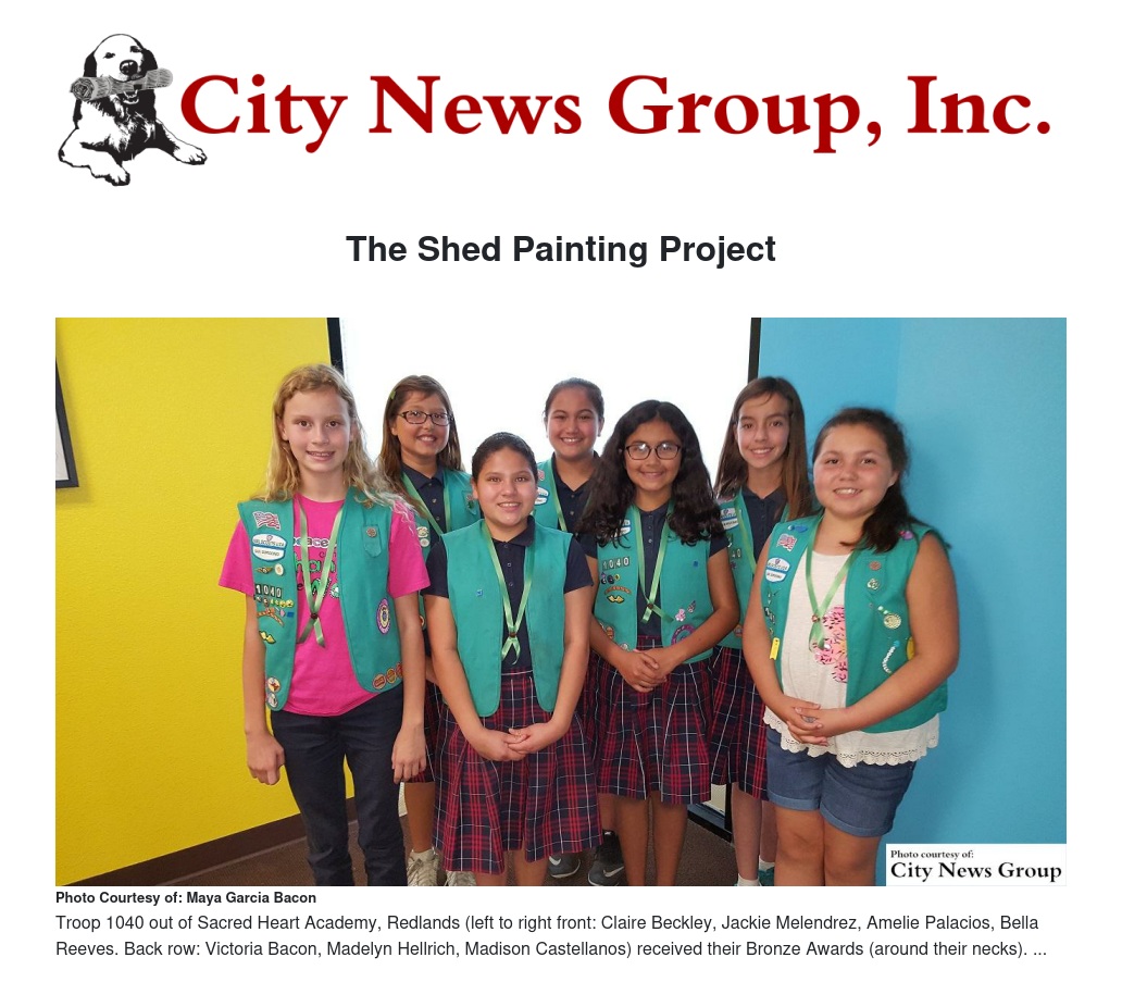 GRAND TERRACE >> My Girl Scout Junior Troop [1040] completed our Bronze Award Project. The Bronze Award is the 1st major award a Girl Scout can earn. You have to be a Junior to be awarded this. My troop agreed to repaint the volleyball shed at our school, Sacred Heart Academy in Redlands.