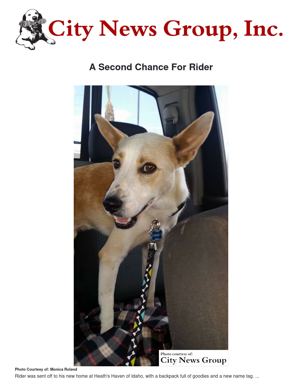 Luckily for Rider, he was microchipped by the previous shelter in which he stayed, which gives a dog 10 days to have its owners notified as opposed to the normal three day hold. Even though Rider's family could not be reached, the extra time gave Roland a chance to contact Heath's Haven of Idaho, ran by Jolene Heath. The shelter specializes in saving disabled and handicapped animals.