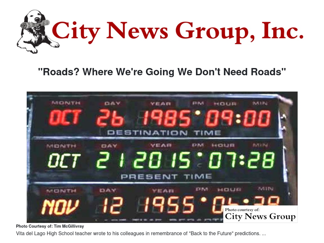 For Vista del Lago High School teacher John Rose, Wednesday Oct. 21 was cause for pause, it being Oct. 21, 2015. That’s the far-off date in the unimaginable future to which Marty McFly (Michael J. Fox) flew his DeLorean in the movie “Back to the Future Part II” in 1985.