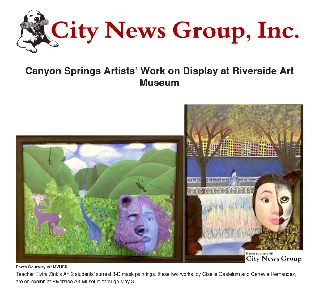 Canyon Springs High School teacher Elvira Zink’s Art 2 students recently completed surreal 3-D mask paintings inspired by the TV show Face Off, and these two works, by Giselle Gastelum and Genevie Hernandez, are now on exhibit at Riverside Art Museum through May 3.
