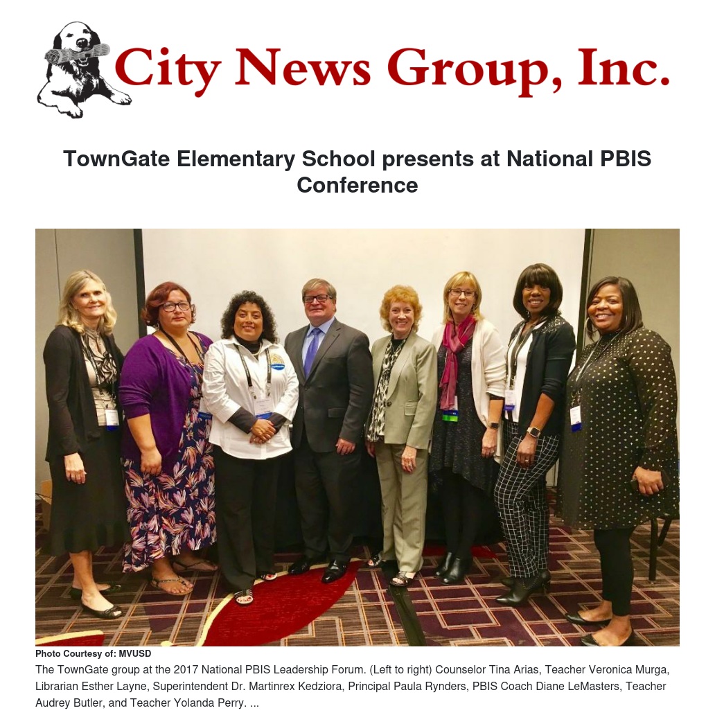 A newly-awarded Positive Behavior Interventions and Supports (PBIS) Gold Medal school, our own TownGate Elementary School is now showcasing their behavior programs with school leaders from around the nation during a presentation at the 2017 National PBIS Leadership Forum in Chicago.