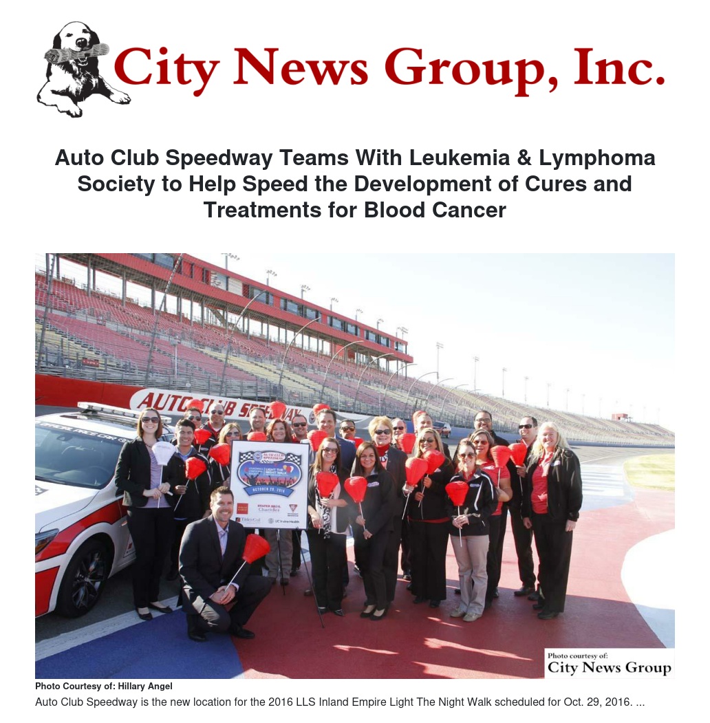 In the race to find cures and treatments for the 80-plus types of blood cancers, Auto Club Speedway in Fontana, has formed a partnership with the Leukemia & Lymphoma Society (LLS), Orange County Inland Empire Chapter.