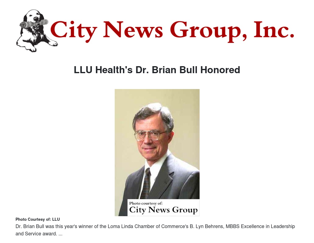 During its annual Installation Banquet and Awards Ceremony, the Loma Linda Chamber of Commerce presented its B. Lyn Behrens, MBBS Excellence in Leadership and Service award to Dr. Brian Bull.