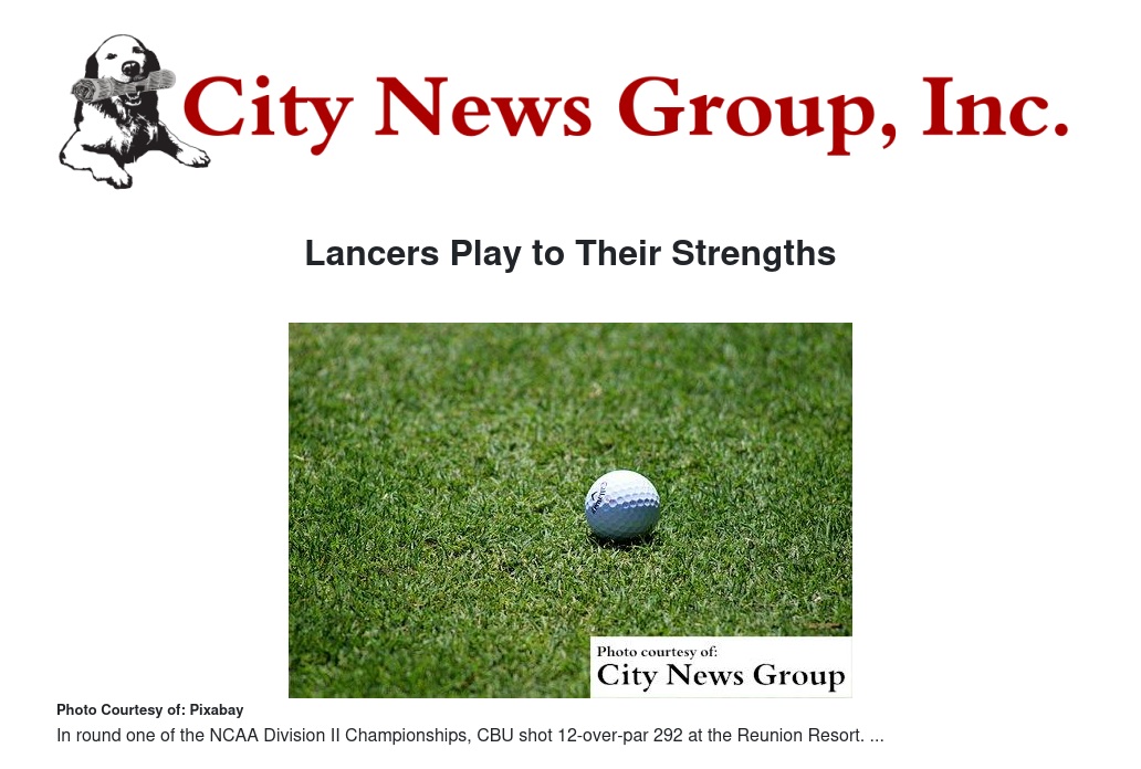 In round one of the NCAA Division II Championships, CBU shot 12-over-par 292 at the Reunion Resort. It put the West/South Central champion Lancers in 13th place and just five shots off the top-eight finish they need to advance to Thursday’s match play after three rounds.
