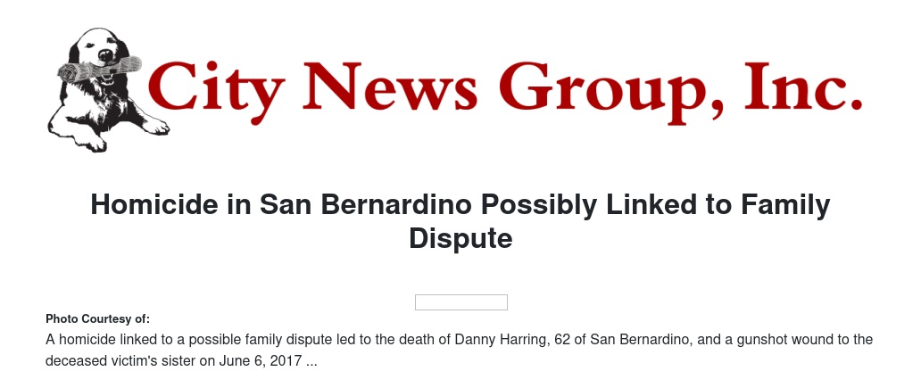 A homicide linked to a possible family dispute led to the death of Danny Harring, 62 of San Bernardino, and a gunshot wound to the deceased victim's sister on June 6, 2017. At approximately 7:46 p.m., the San Bernardino Police Department received a 911 call regarding a shooting in the 1400 block of N. Grand Street.