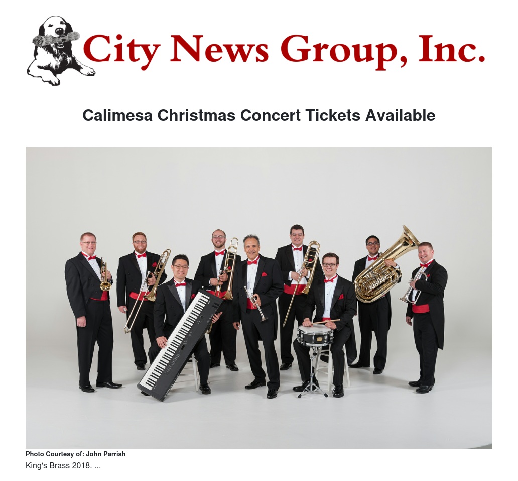 “Tim Zimmerman and the King’s Brass” will be joined by the five-member male vocal group “VERITAS” in this year’s concerts at the Calimesa Seventh-day Adventist Church, 391 Myrtlewood Drive, on Friday, Dec. 21, at 6 p.m. and Saturday, December 22, at 4 p.m. Both (more) performances will be followed by light refreshments and a “meet-and-greet” opportunity with the musicians, Soderblom says.